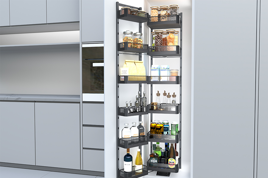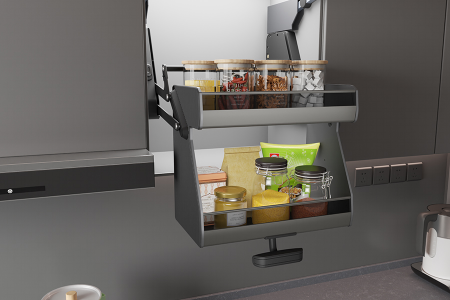 높은 벽 캐비닛용 (예를 들어, 냉장고 위나 천장이 높은 주방), 풀다운 선반은 필수입니다. 부드러운 잡아당김으로, 전체 선반이 카운터 높이로 낮아집니다..