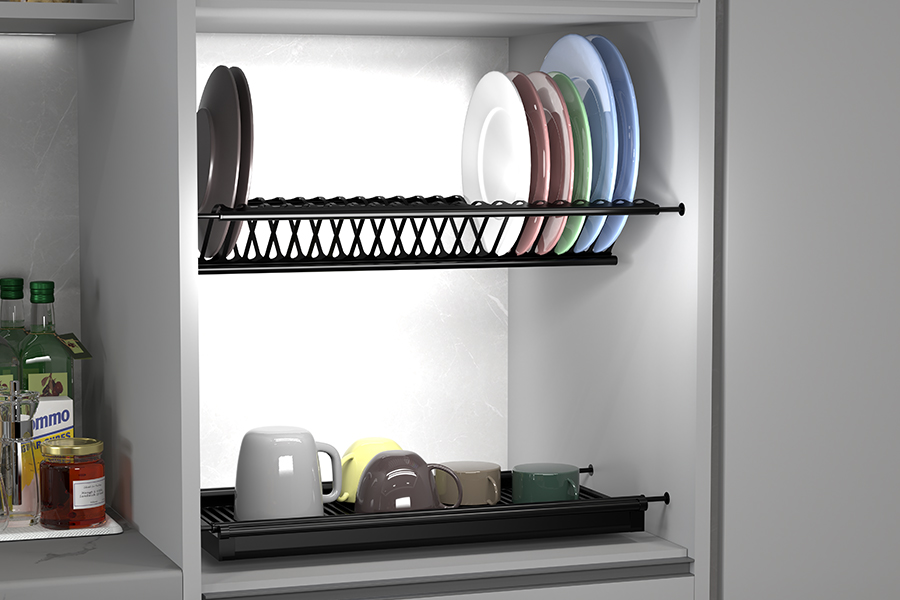 이 혁신적인 액세서리는 싱크대 위 벽 캐비닛 내부에 장착됩니다.. 설거지 후, 랙에 직접 놓으세요.. 전체 랙이 위로 올라가 캐비닛에 고정됩니다., 물이 아래 싱크대에 떨어지도록 허용. 더 이상 조리대 건조대가 필요하지 않습니다..
