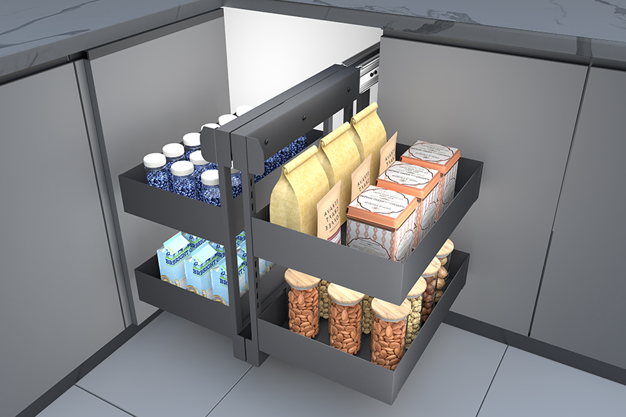 매직 코너 풀아웃 바스켓은 사각지대 최적화의 표준입니다.. 두 개의 바구니가 연결된 디자인이 특징입니다.: 캐비닛 문을 열면, 앞바구니가 튀어나온다, 뒤쪽 바구니를 동시에 앞으로 당기기. 모든 인치에 접근 가능.